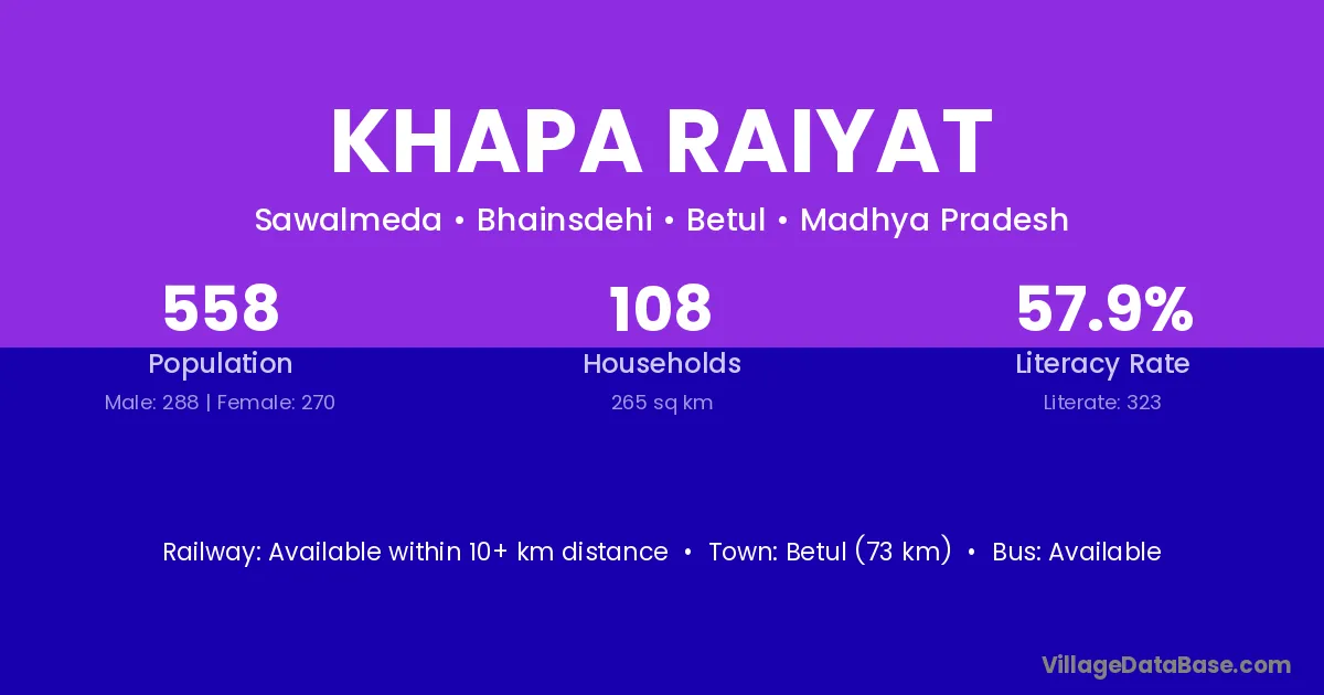 Betul (73 km) is the nearest town to Khapa Raiyat village for major economic activities and is located approximately 73 km away.