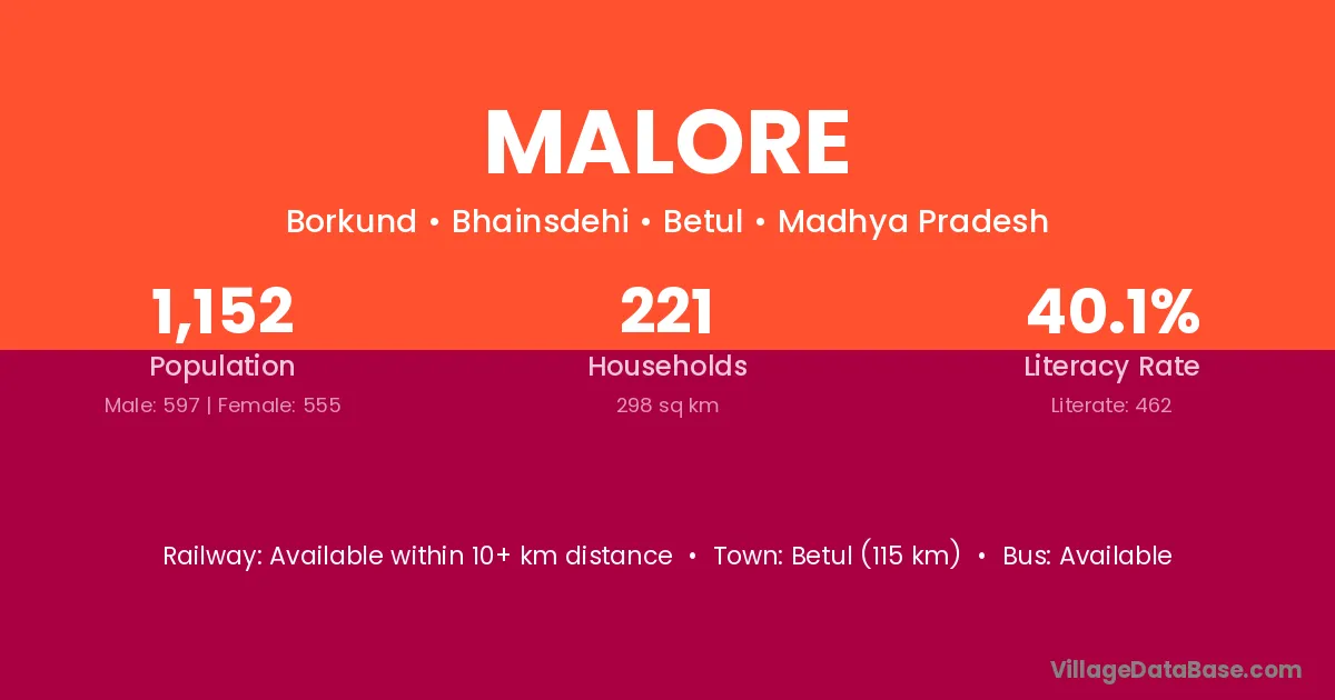 Betul (115 km) is the nearest town to Malore village for major economic activities and is located approximately 115 km away.