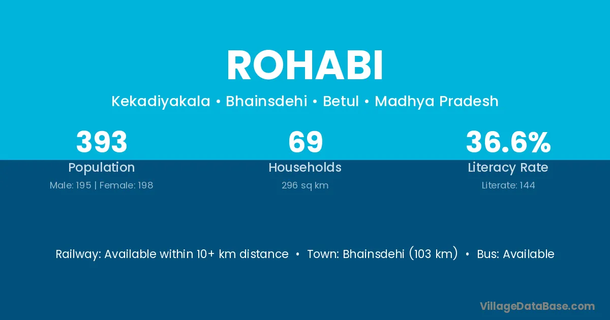 Bhainsdehi (103 km) is the nearest town to Rohabi village for major economic activities and is located approximately 103 km away.