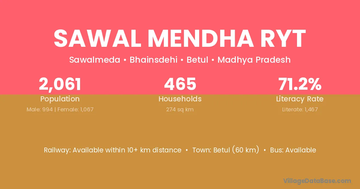 Betul (60 km) is the nearest town to Sawal Mendha Ryt village for major economic activities and is located approximately 60 km away.