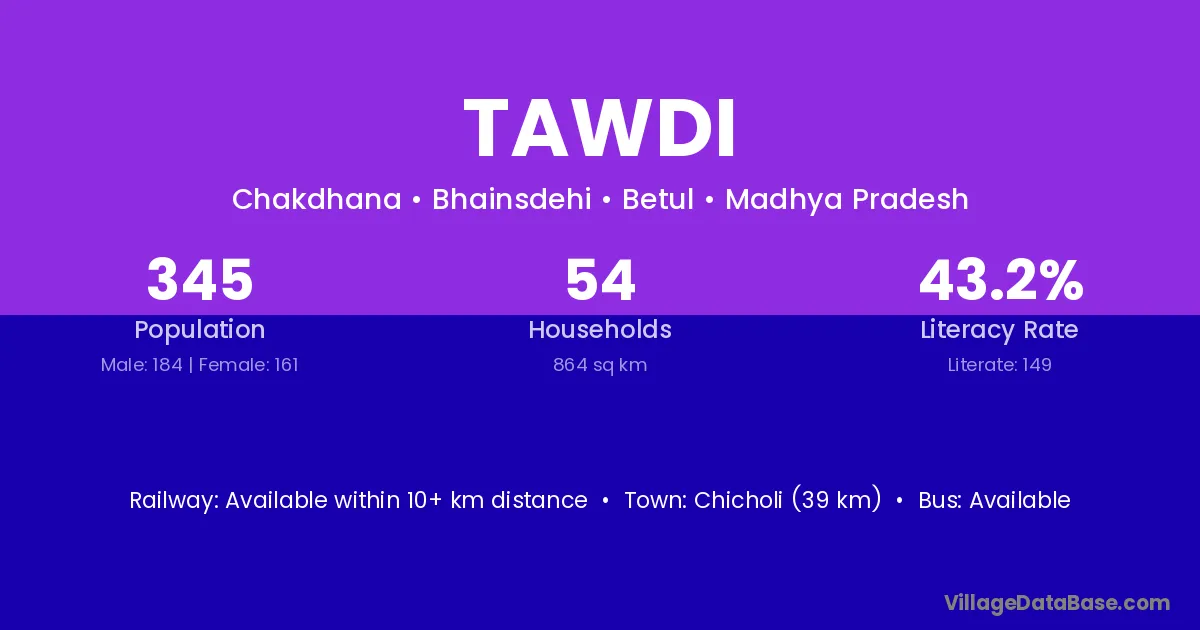 Chicholi (39 km) is the nearest town to Tawdi village for major economic activities and is located approximately 39 km away.