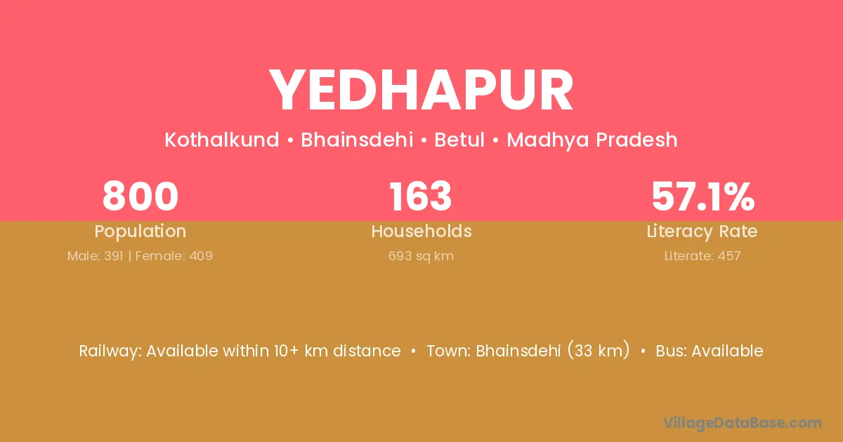 Bhainsdehi (33 km) is the nearest town to Yedhapur village for major economic activities and is located approximately 33 km away.