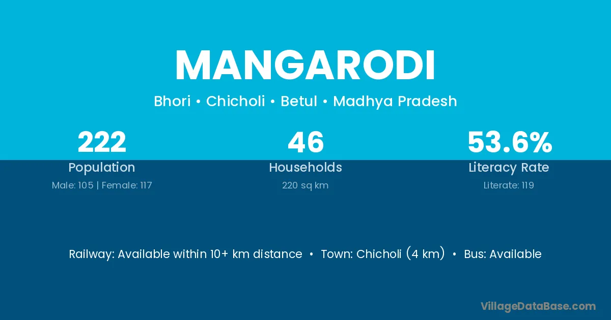 Chicholi (4 km) is the nearest town to Mangarodi village for major economic activities and is located approximately 4 km away.