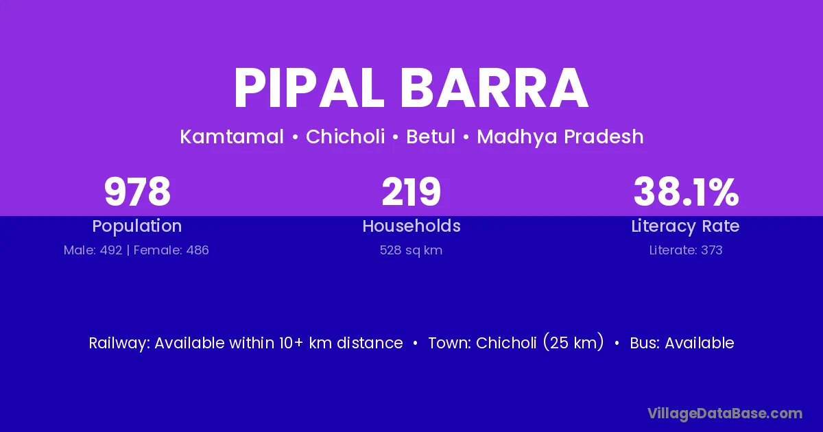 Chicholi (25 km) is the nearest town to Pipal Barra village for major economic activities and is located approximately 25 km away.