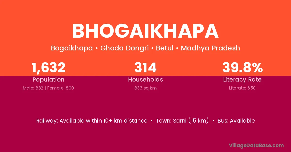 Sarni (15 km) is the nearest town to Bhogaikhapa village for major economic activities and is located approximately 15 km away.