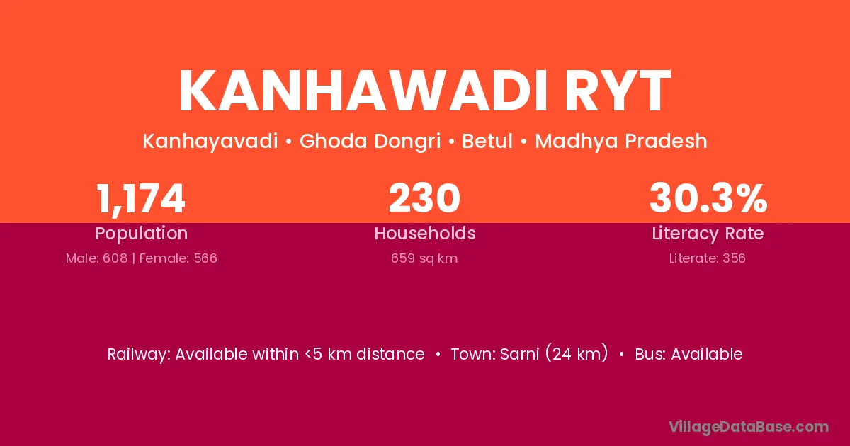 Sarni (24 km) is the nearest town to Kanhawadi Ryt village for major economic activities and is located approximately 24 km away.