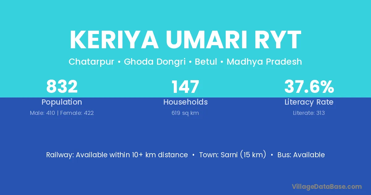 Sarni (15 km) is the nearest town to Keriya Umari Ryt village for major economic activities and is located approximately 15 km away.