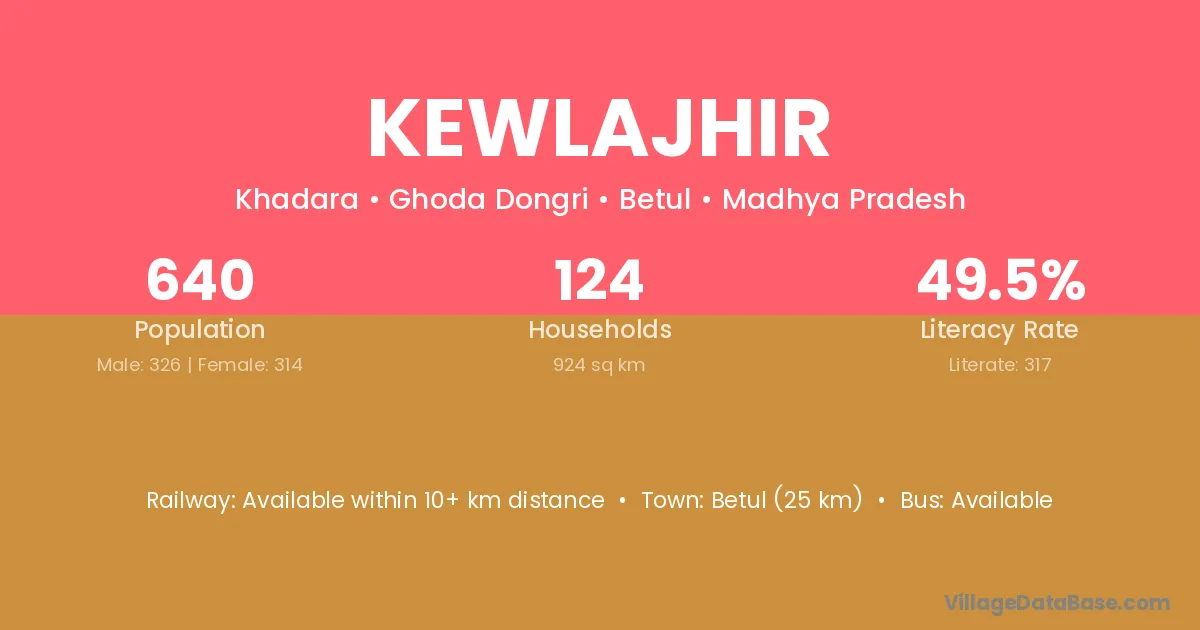 Betul (25 km) is the nearest town to Kewlajhir village for major economic activities and is located approximately 25 km away.