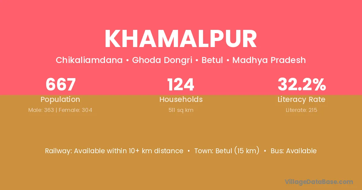 Betul (15 km) is the nearest town to Khamalpur village for major economic activities and is located approximately 15 km away.