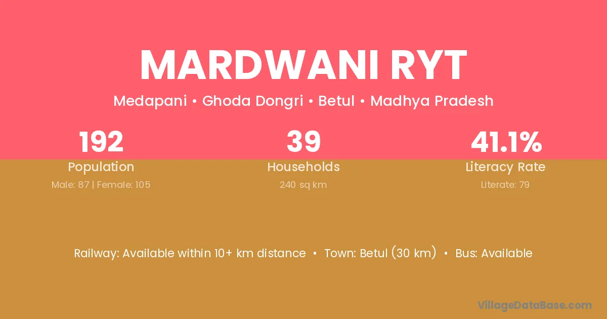 Betul (30 km) is the nearest town to Mardwani Ryt village for major economic activities and is located approximately 30 km away.