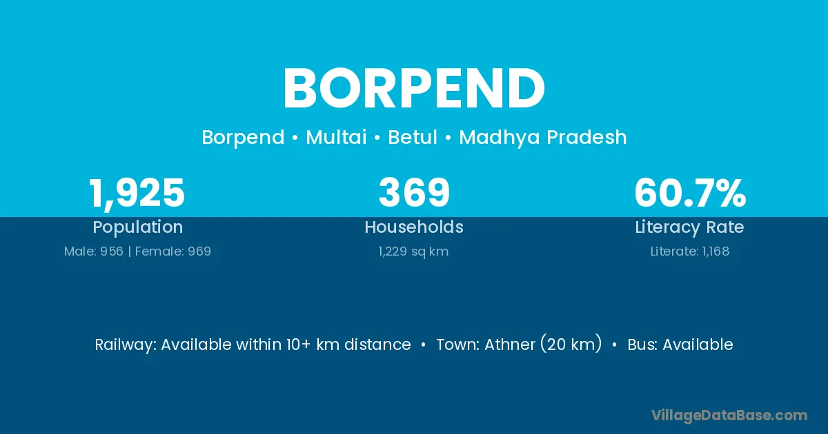 Athner (20 km) is the nearest town to Borpend village for major economic activities and is located approximately 20 km away.