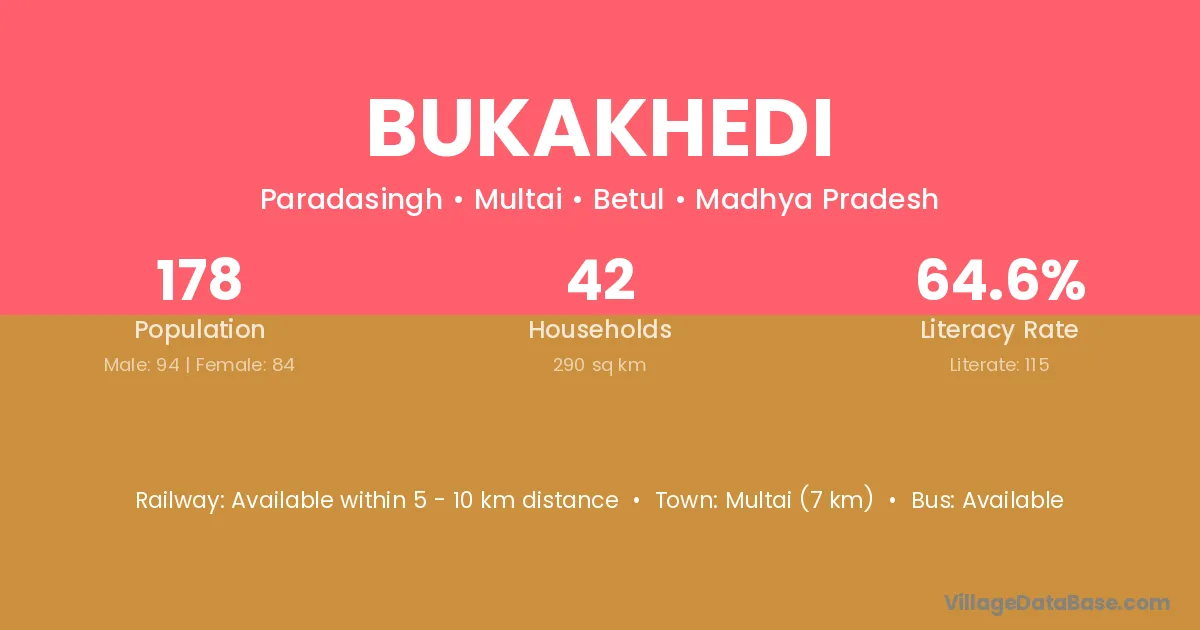 Bukakhedi village has a total population of 178 people, of which 94 are males and 84 are females.