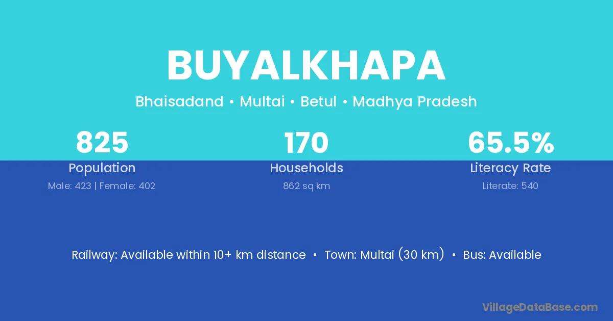 Multai (30 km) is the nearest town to Buyalkhapa village for major economic activities and is located approximately 30 km away.