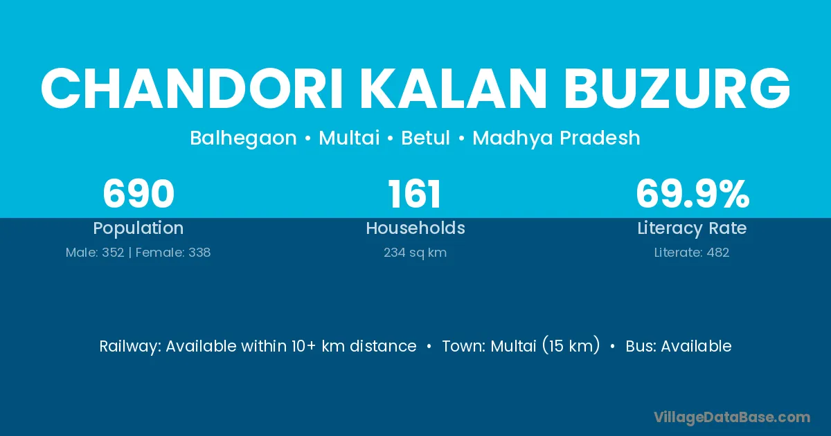 Multai (15 km) is the nearest town to Chandori Kalan Buzurg village for major economic activities and is located approximately 15 km away.