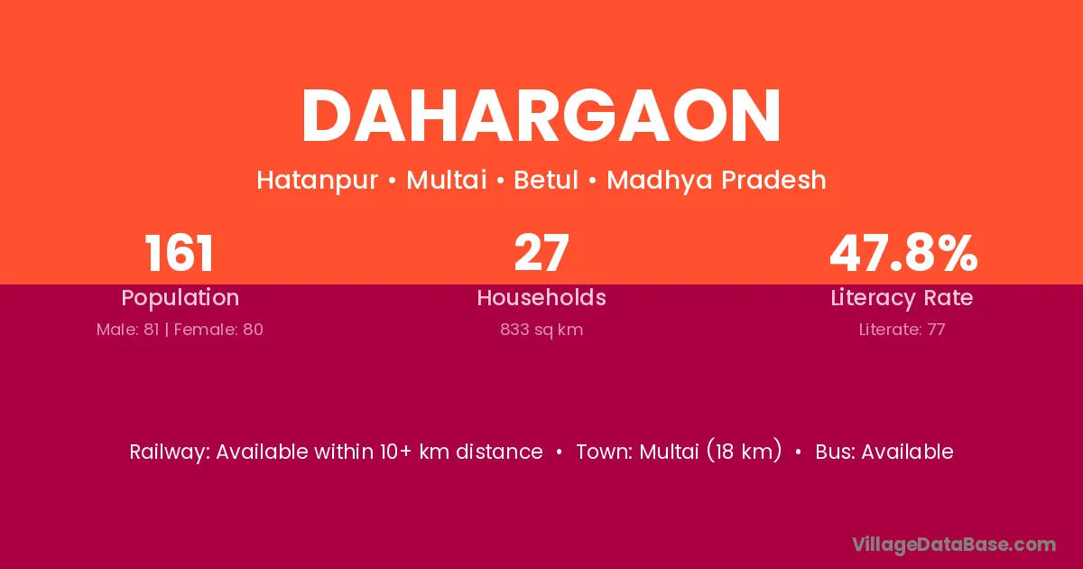 Multai (18 km) is the nearest town to Dahargaon village for major economic activities and is located approximately 18 km away.