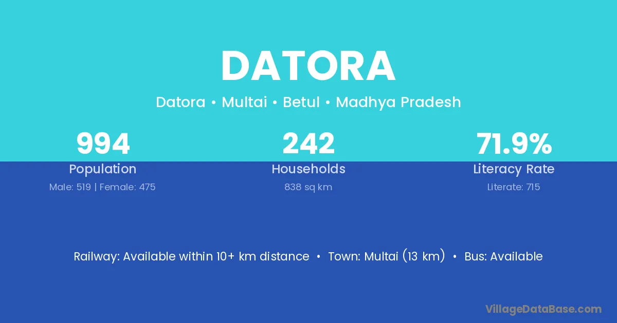 Multai (13 km) is the nearest town to Datora village for major economic activities and is located approximately 13 km away.