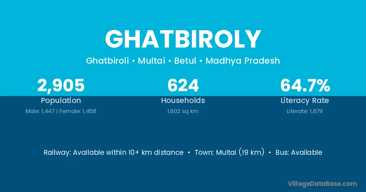 Multai (19 km) is the nearest town to Ghatbiroly village for major economic activities and is located approximately 19 km away.