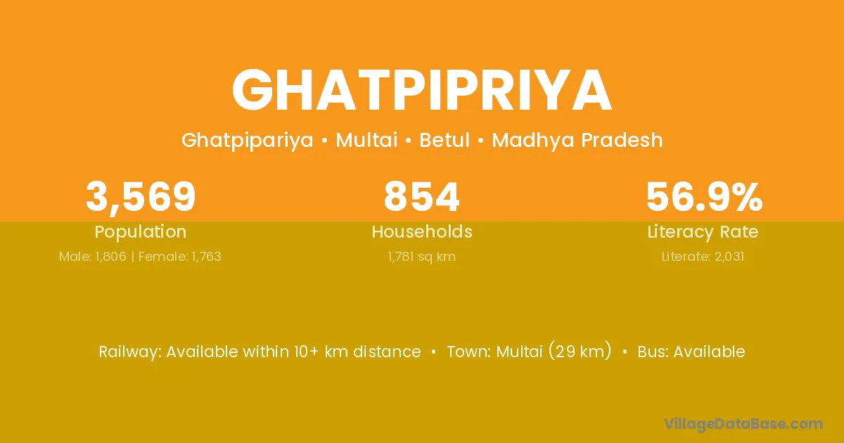 Multai (29 km) is the nearest town to Ghatpipriya village for major economic activities and is located approximately 29 km away.