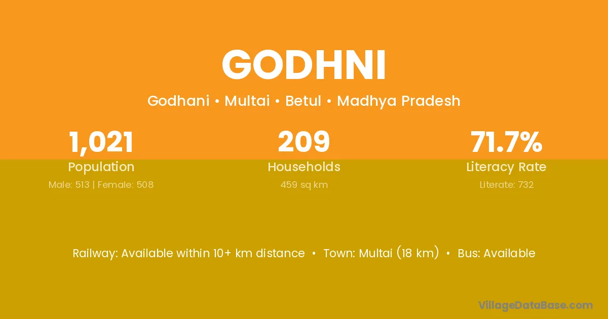 Multai (18 km) is the nearest town to Godhni village for major economic activities and is located approximately 18 km away.