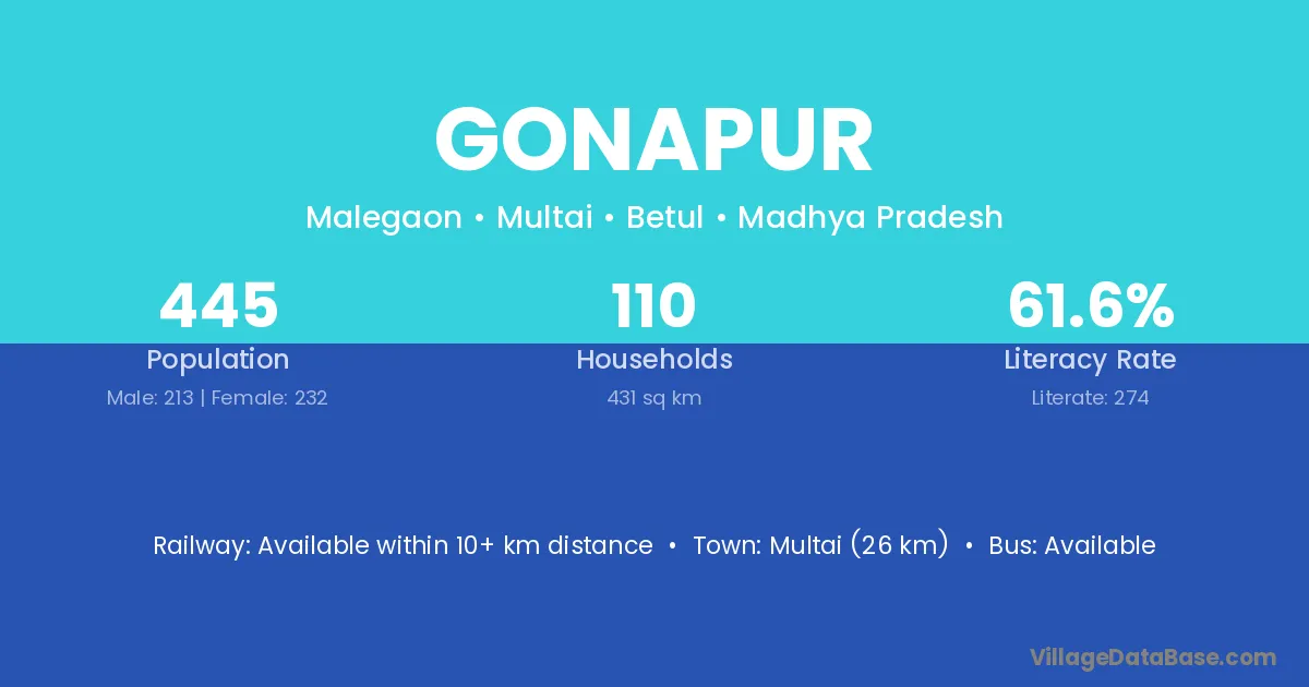 Multai (26 km) is the nearest town to Gonapur village for major economic activities and is located approximately 26 km away.