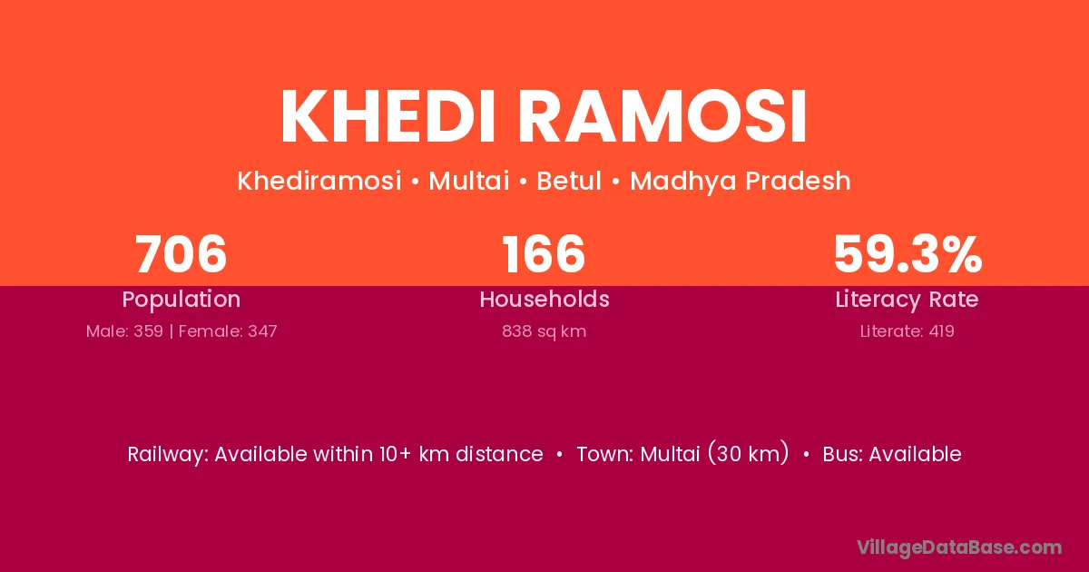 Multai (30 km) is the nearest town to Khedi Ramosi village for major economic activities and is located approximately 30 km away.