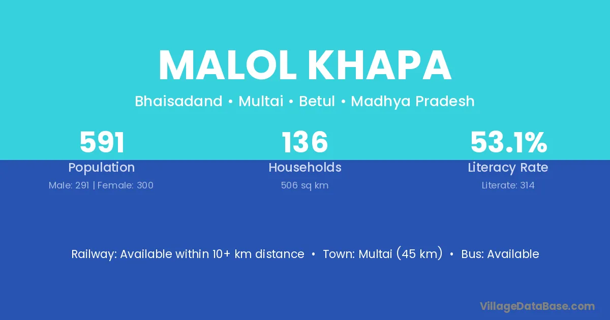 Multai (45 km) is the nearest town to Malol Khapa village for major economic activities and is located approximately 45 km away.