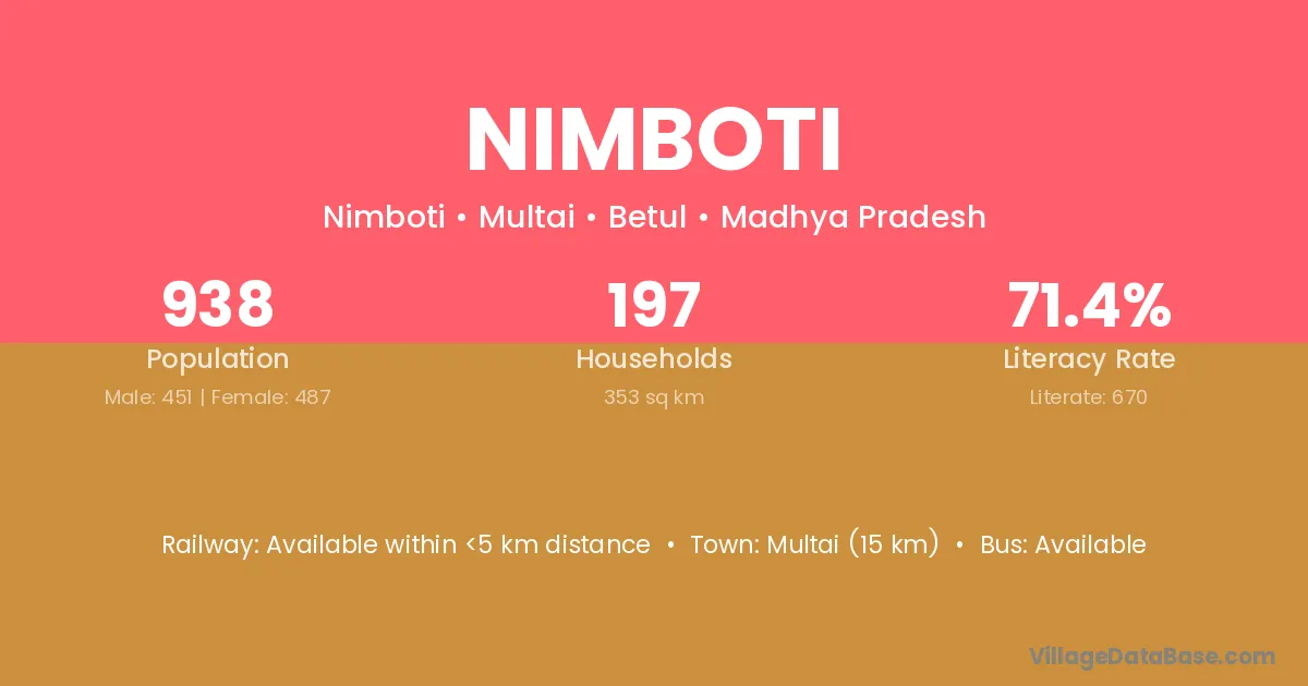 Multai (15 km) is the nearest town to Nimboti village for major economic activities and is located approximately 15 km away.