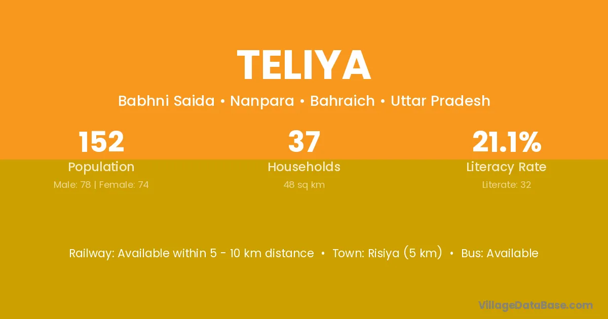 The literacy rate of Teliya village is 37.77%. Male literacy stands at 41.91% and female literacy at 33.80%.