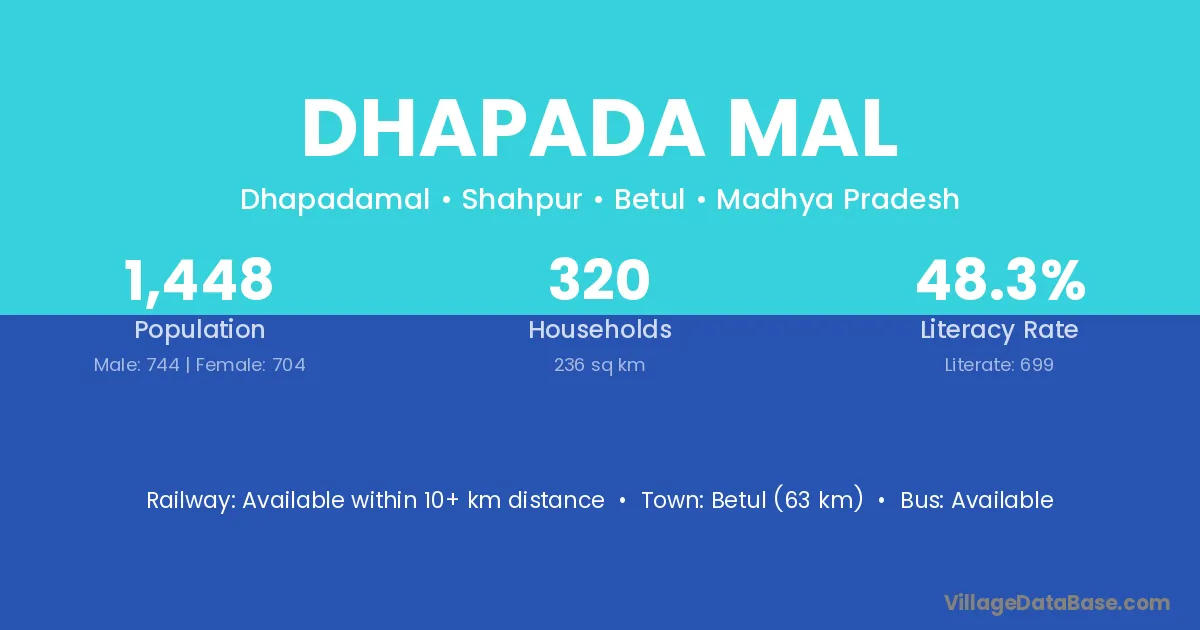 Betul (63 km) is the nearest town to Dhapada Mal village for major economic activities and is located approximately 63 km away.