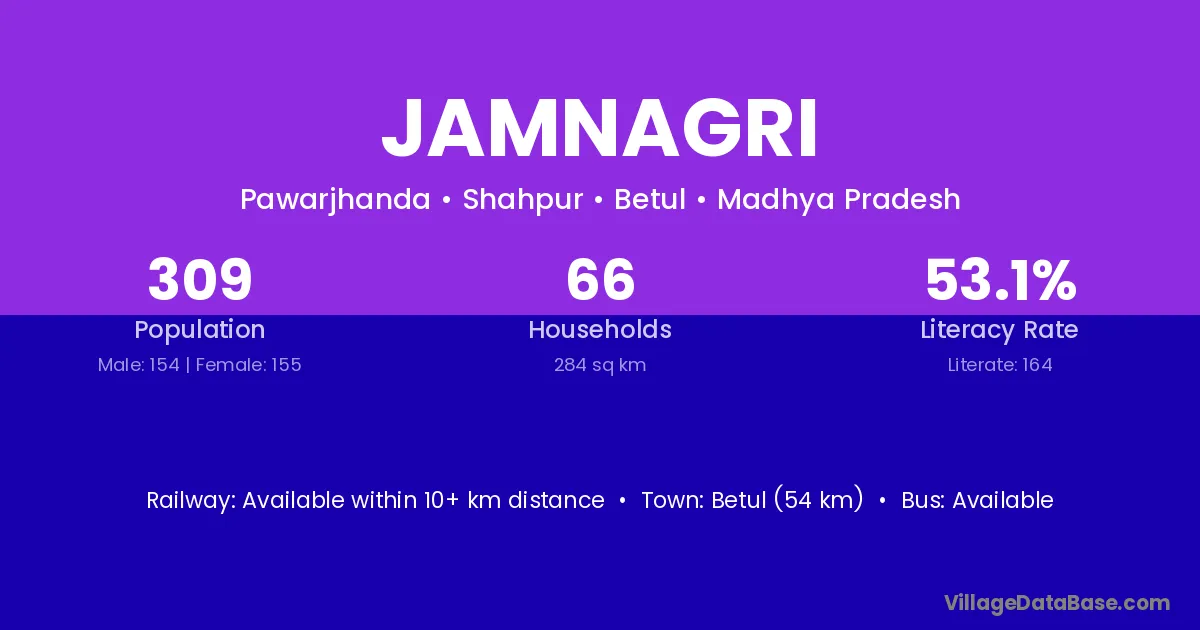 Betul (54 km) is the nearest town to Jamnagri village for major economic activities and is located approximately 54 km away.