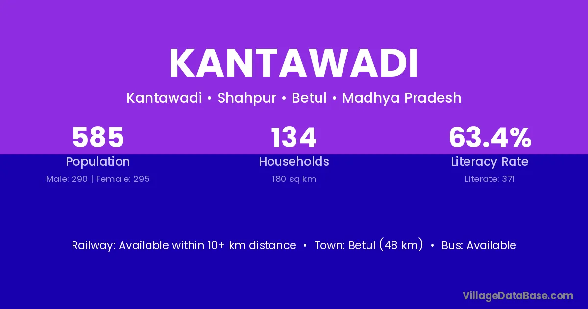 Betul (48 km) is the nearest town to Kantawadi village for major economic activities and is located approximately 48 km away.