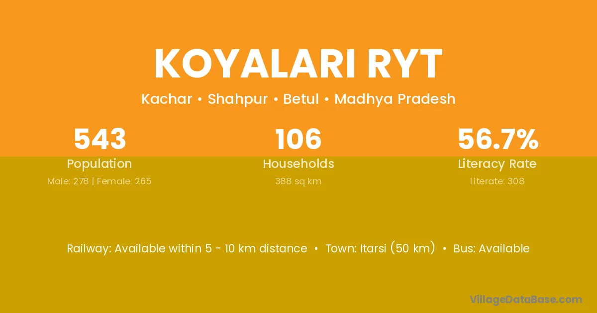 Itarsi (50 km) is the nearest town to Koyalari Ryt village for major economic activities and is located approximately 50 km away.