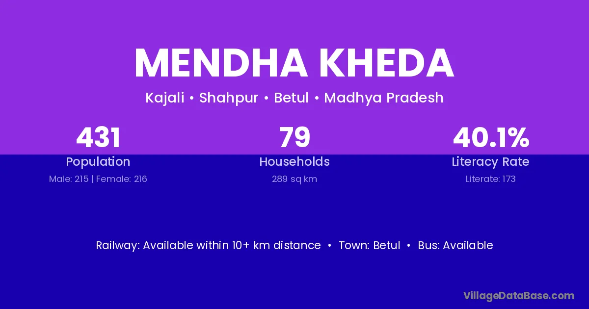 Mendha Kheda village has a total population of 431 people, of which 215 are males and 216 are females.