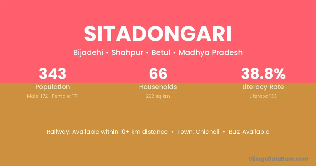 Sitadongari village has a total population of 343 people, of which 172 are males and 171 are females.