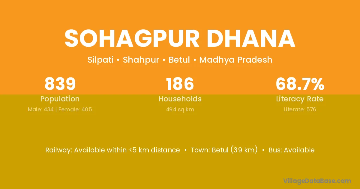 Betul (39 km) is the nearest town to Sohagpur Dhana village for major economic activities and is located approximately 39 km away.