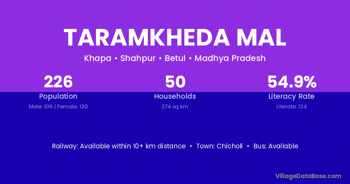 Taramkheda Mal village has a total population of 226 people, of which 106 are males and 120 are females.