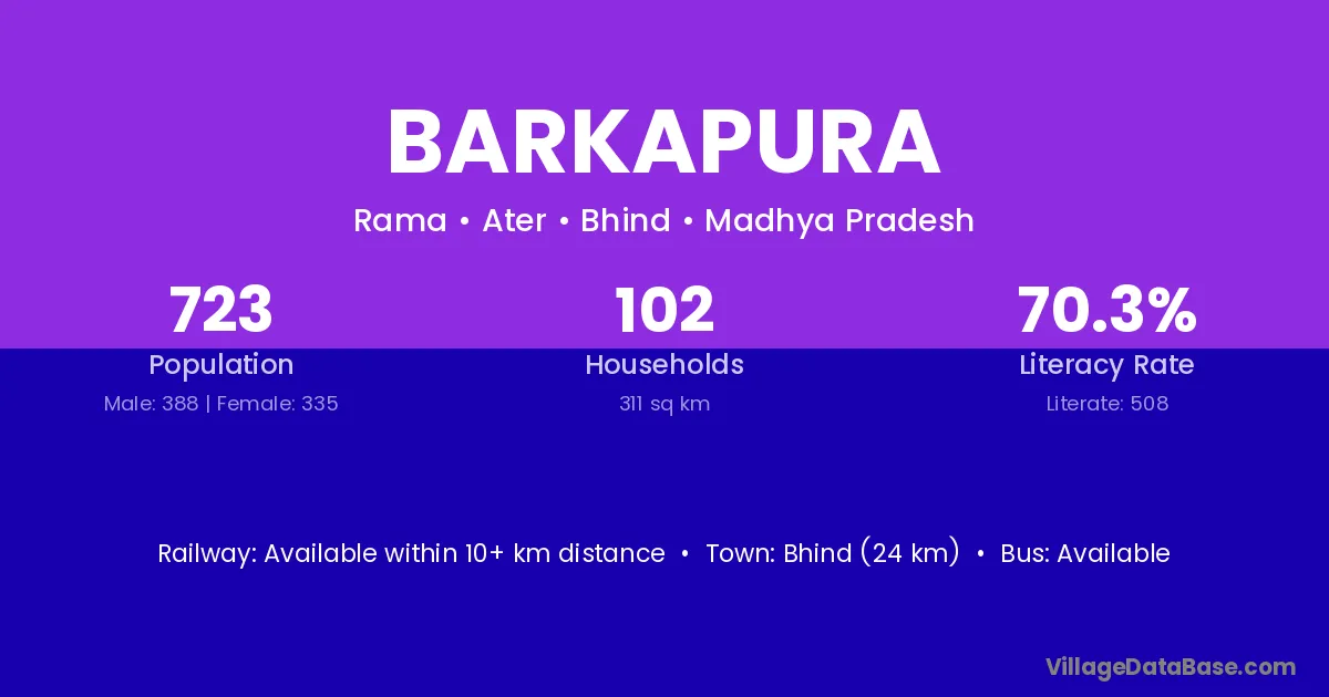Bhind (24 km) is the nearest town to Barkapura village for major economic activities and is located approximately 24 km away.