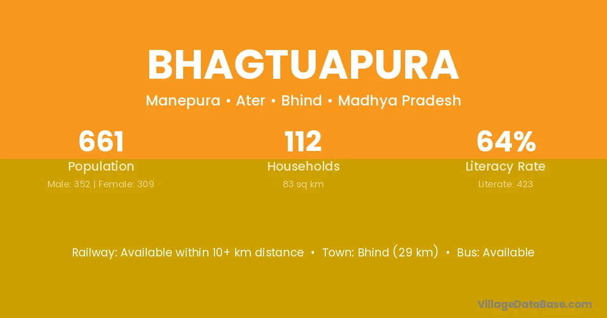 Bhind (29 km) is the nearest town to Bhagtuapura village for major economic activities and is located approximately 29 km away.