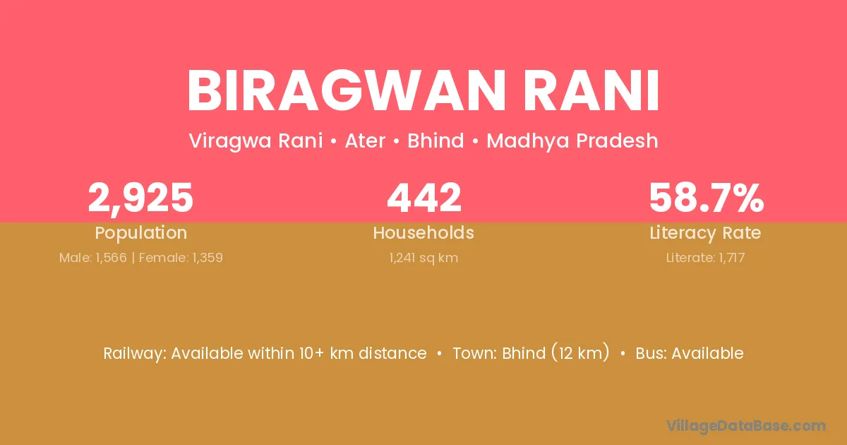 Bhind (12 km) is the nearest town to Biragwan Rani village for major economic activities and is located approximately 12 km away.