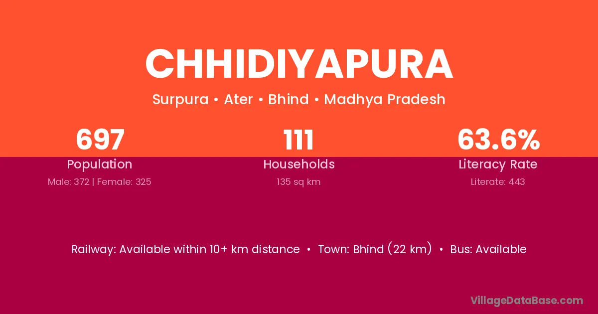 Bhind (22 km) is the nearest town to Chhidiyapura village for major economic activities and is located approximately 22 km away.