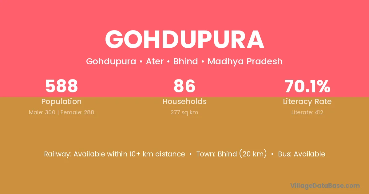Bhind (20 km) is the nearest town to Gohdupura village for major economic activities and is located approximately 20 km away.