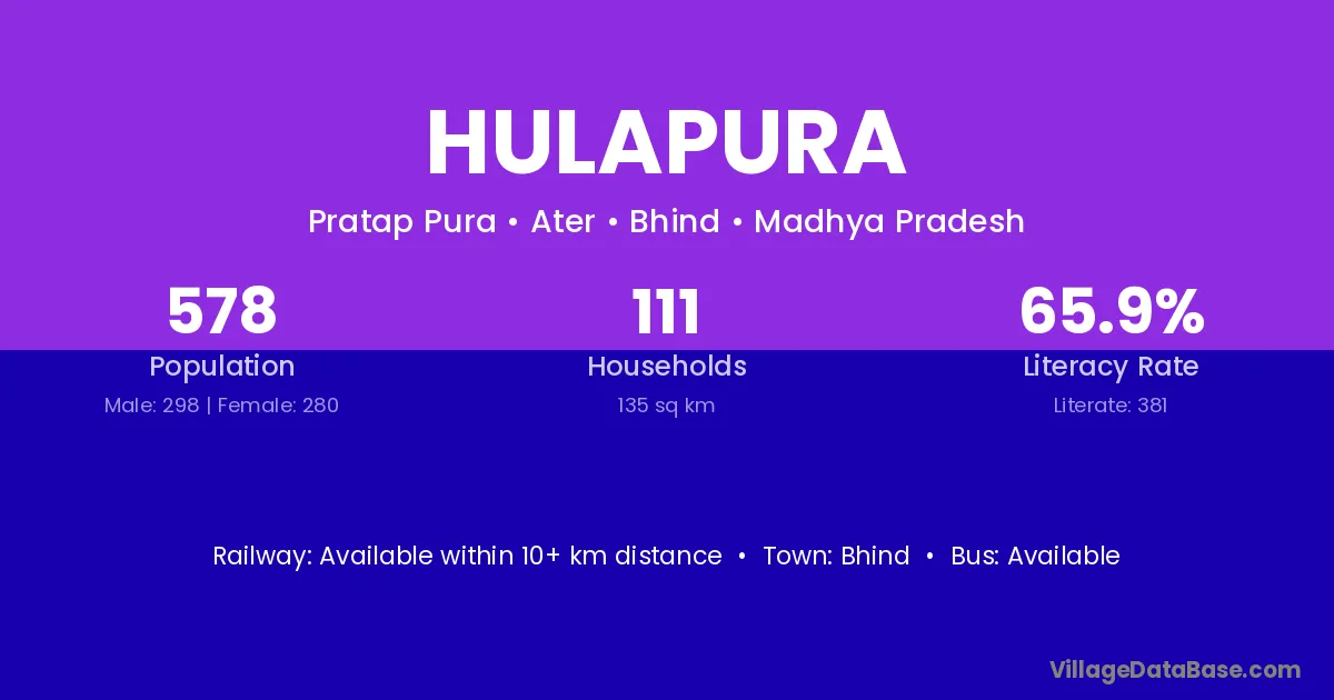 Hulapura village has a total population of 578 people, of which 298 are males and 280 are females.