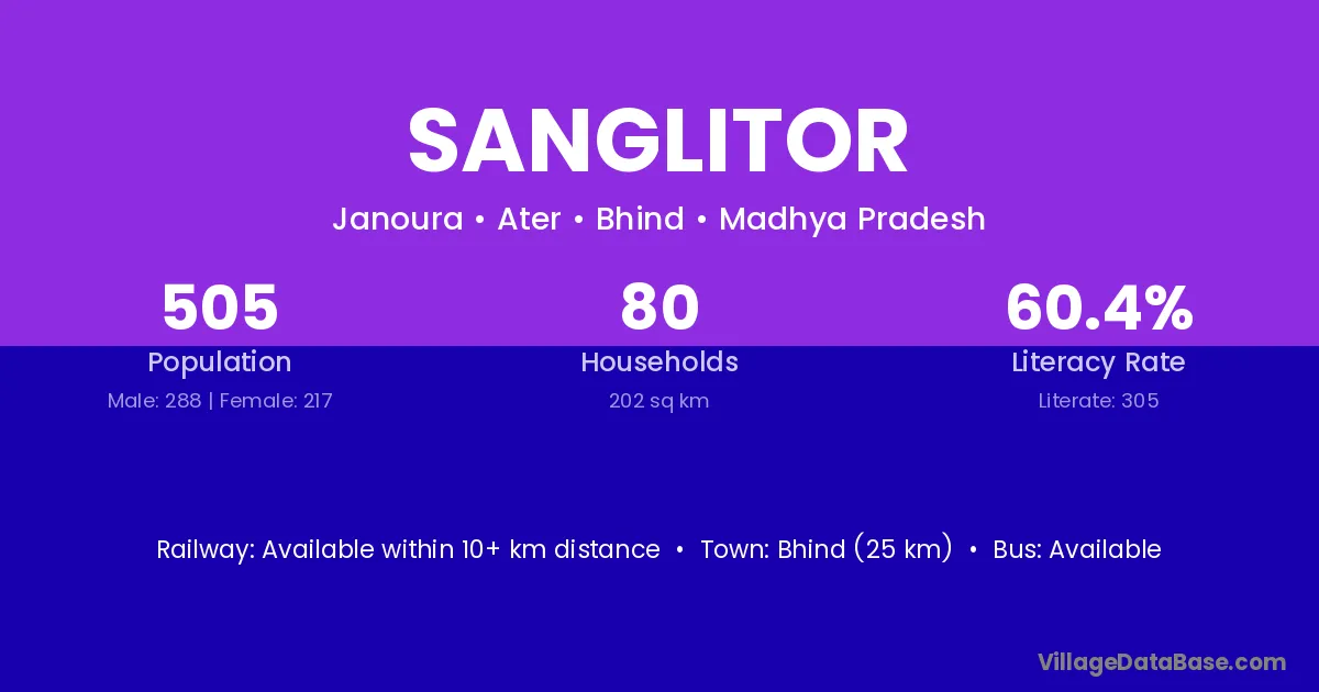 Bhind (25 km) is the nearest town to Sanglitor village for major economic activities and is located approximately 25 km away.