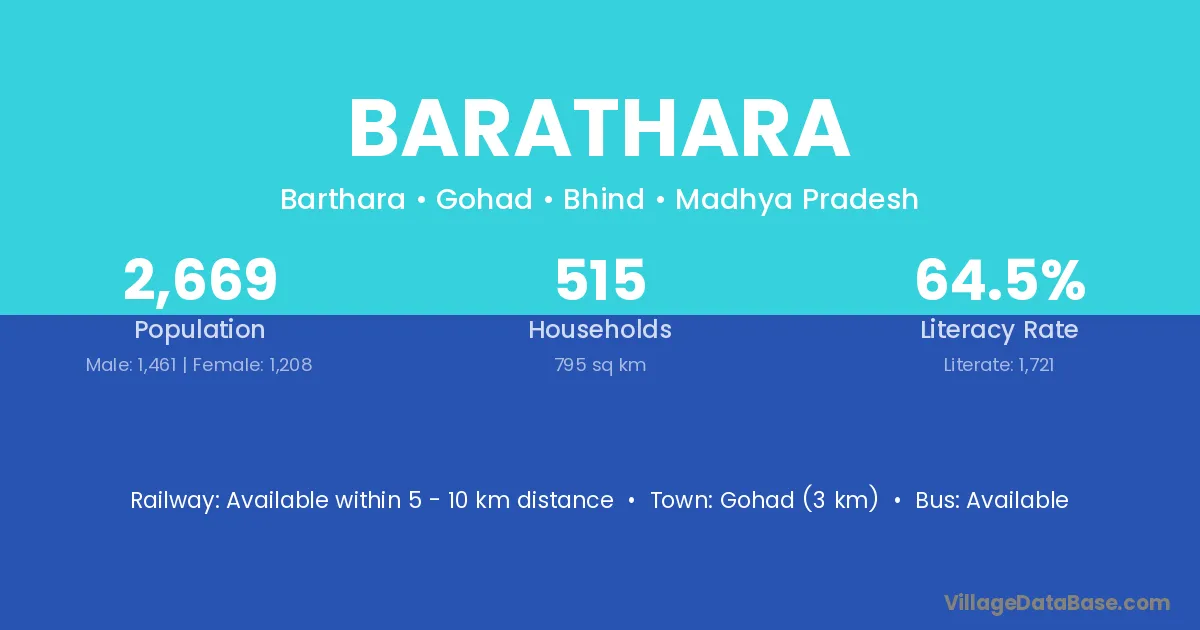 Gohad (3 km) is the nearest town to Barathara village for major economic activities and is located approximately 3 km away.