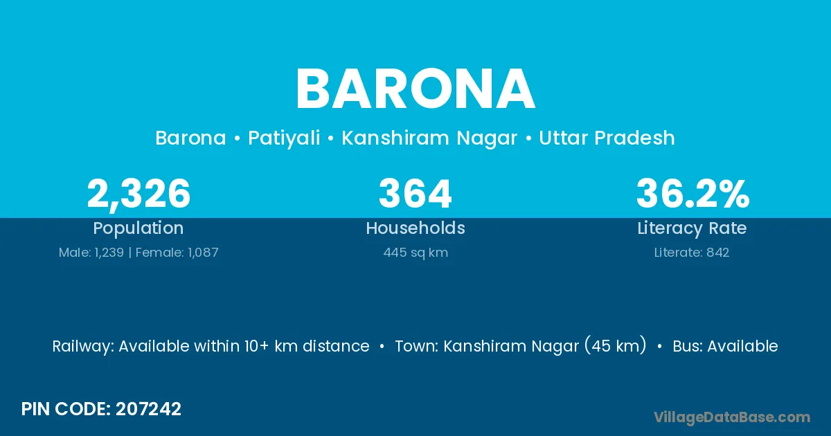 Gohad (33 km) is the nearest town to Barona village for major economic activities and is located approximately 33 km away.