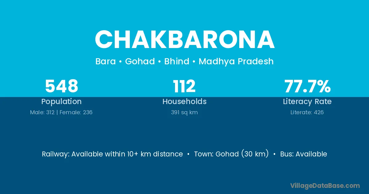 Gohad (30 km) is the nearest town to Chakbarona village for major economic activities and is located approximately 30 km away.