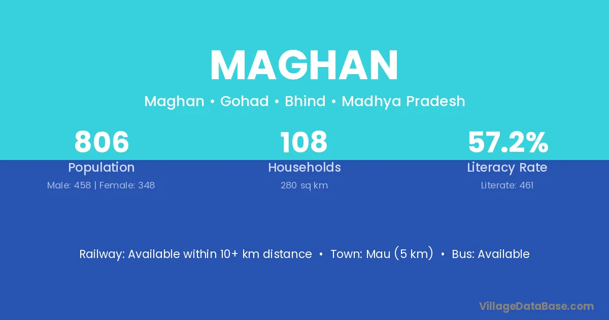 Mau (5 km) is the nearest town to Maghan village for major economic activities and is located approximately 5 km away.