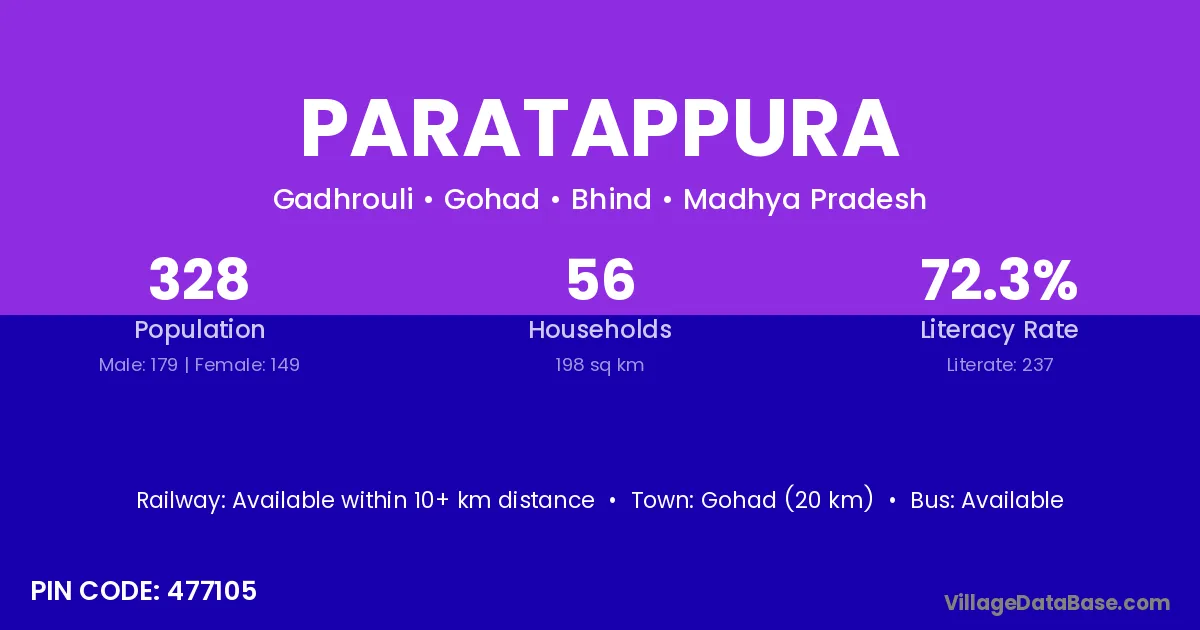 Gohad (20 km) is the nearest town to Paratappura village for major economic activities and is located approximately 20 km away.