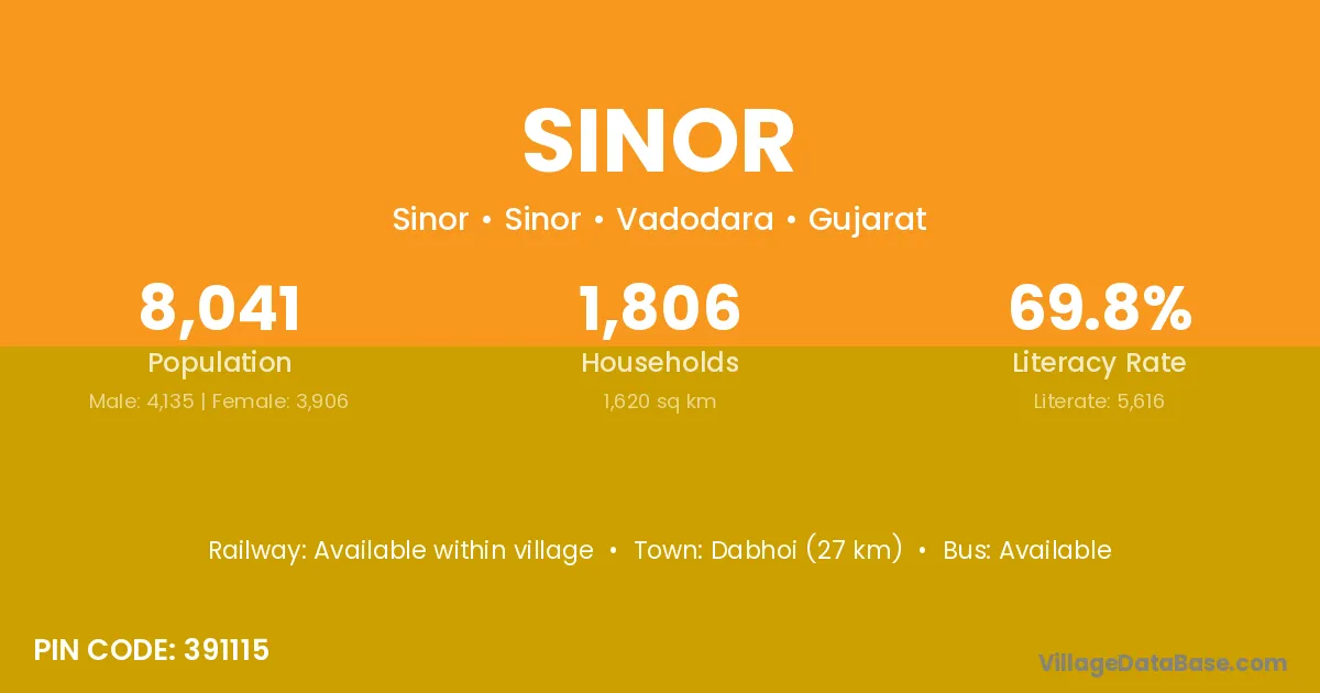 Mau (6 km) is the nearest town to Sinor village for major economic activities and is located approximately 6 km away.