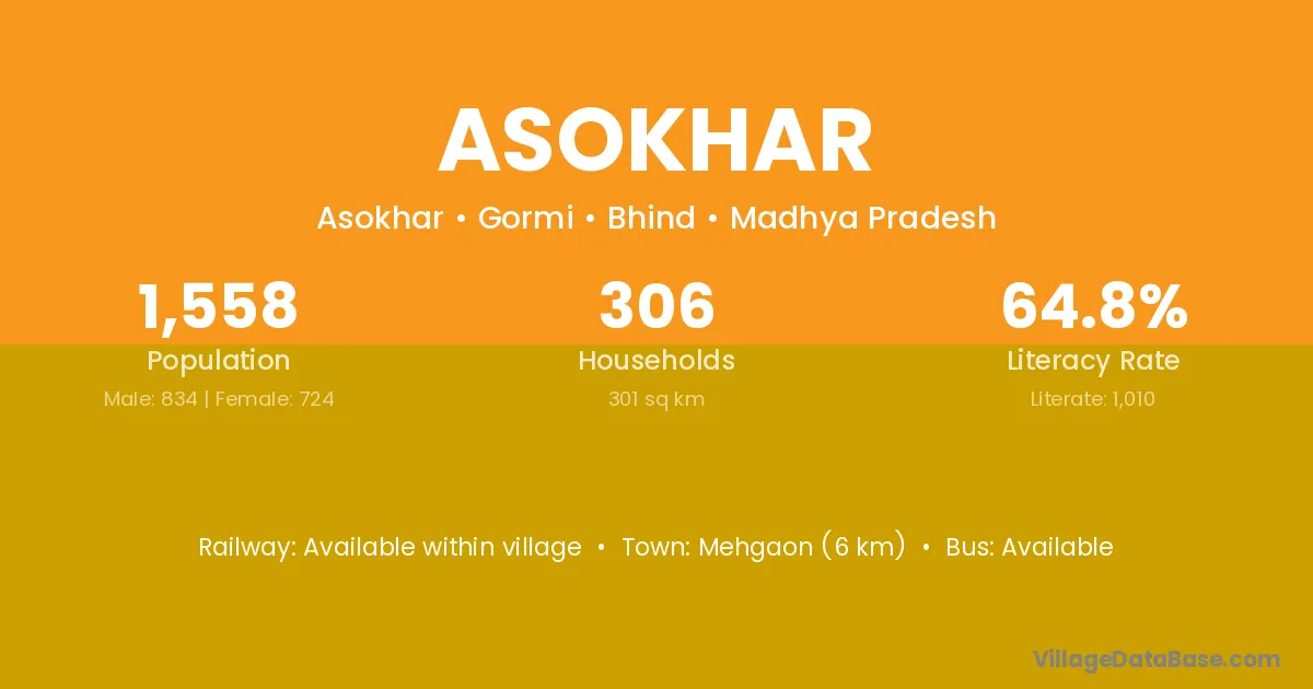 Mehgaon (6 km) is the nearest town to Asokhar village for major economic activities and is located approximately 6 km away.